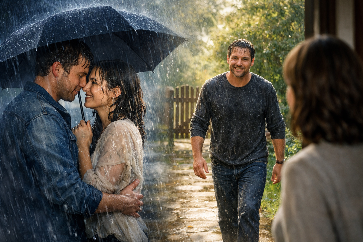 Андрей шёл по дорожке. Без зонта, без куртки, просто в свитере — насквозь промокший, взъерошенный.