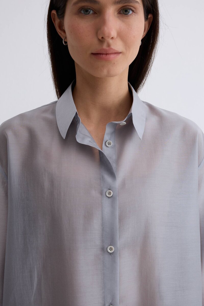 Классическая рубашка свободного кроя. Шелковистая, воздушная, при это ткань немного сухая, что создает форму, а не свивает. По бокам разрезы. Рубашка просвечивает.