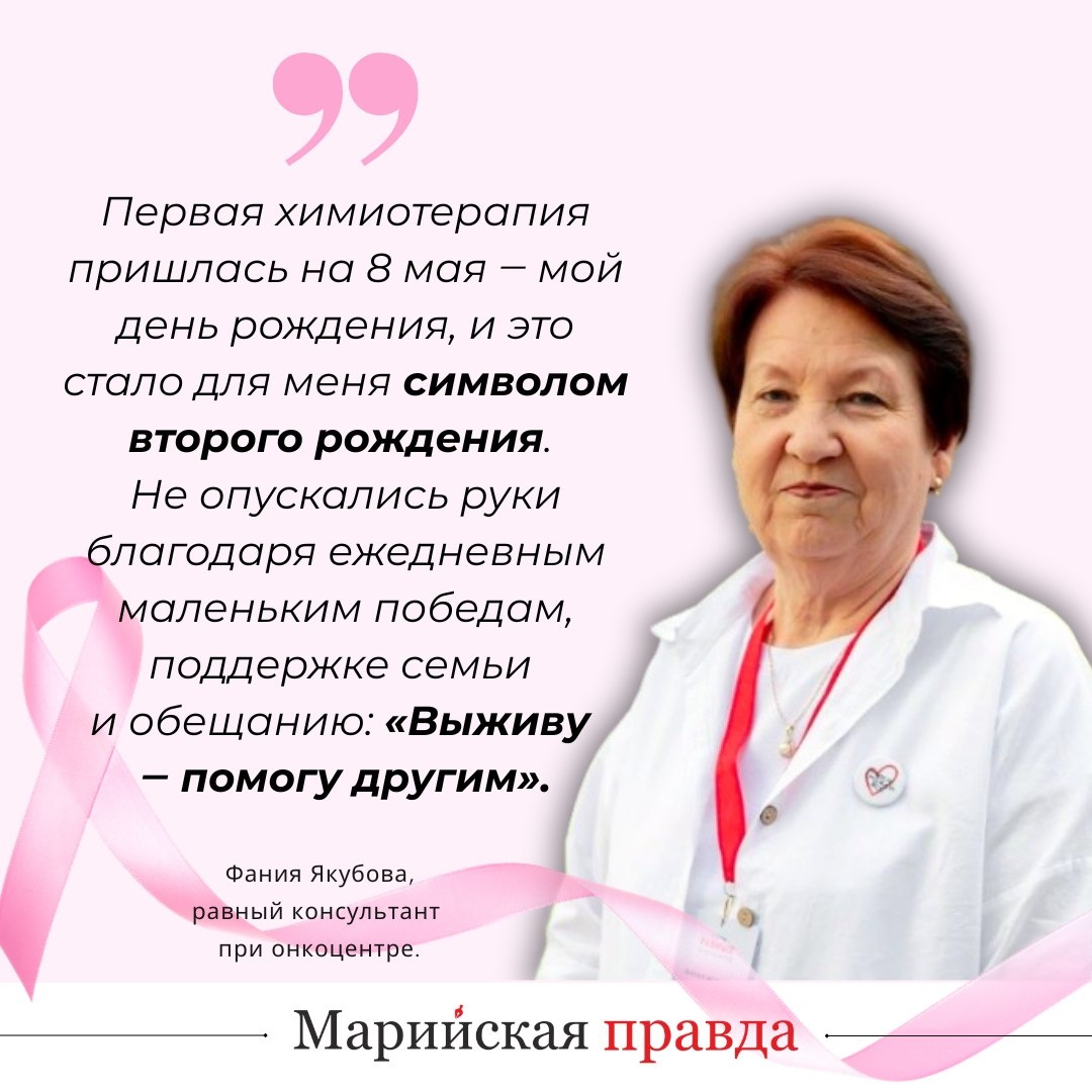 Столкнувшись с онкозаболеванием, йошкаролинка Фания Якубова пообещала себе: если победит болезнь, то бросит все силы на помощь другим. Так оно и вышло ‒ 66-летняя пенсионерка стала равным консультантом при онкоцентре. ‒ В онкодиагнозе я почти 19 лет. Первая химиотерапия пришлась на 8 мая ‒ мой день рождения, и это стало для меня символом второго рождения. Я прошла химиотерапию, операцию (мастэктомию), лучевую терапию. Лечение длилось около 9 месяцев, рассказывает Фания Якубова. После этого 12 лет ремиссии с регулярными обследованиями. В 2019 году случился рецидив ‒ врачи обнаружили метастазы в легких и костях. В 2023 году наша героиня прошла обучение в фонде «Александра» и стала сертифицированным равным консультантом, состоит в реестре действующих равных консультантов фонда. О вере, силе духа и благодарности – в нашем материале. 📲 Подписывайтесь на «МП» в МАХ