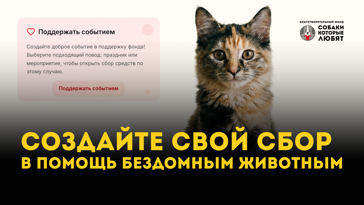 А что, если ваш день рождения, пробежка или мастер-класс станут не просто событием, а поддержкой для собак и кошек из приютов? Есть формат, о котором знают не все. Называется волонтёрский фандрайзинг. Это когда вы сами запускаете сбор в пользу фонда и приглашаете друзей поддержать его вместо привычных подарков или символических взносов за участие. На платформе Donation можно создать личную страницу сбора в пользу фонда «Собаки, которые любят». Это занимает 10–15 минут. Как это работает: 1. Откройте страницу фонда: https://www.donation.ru/funds/23913 2. Справа нажмите «Поддержать событием». 3. Выберите повод: день рождения, забег, лекцию, мастер-класс или любой свой формат. 4. Укажите данные о себе. Важно, чтобы это была не абстрактная инициатива, а ваша личная просьба. 5. Добавьте описание и опубликуйте страницу. Дальше начинается самое интересное: вы делитесь своей ссылкой. Отправляете её в чаты, публикуете в сторис, пишете пару строк о том, почему это важно для вас. Это работает, пот