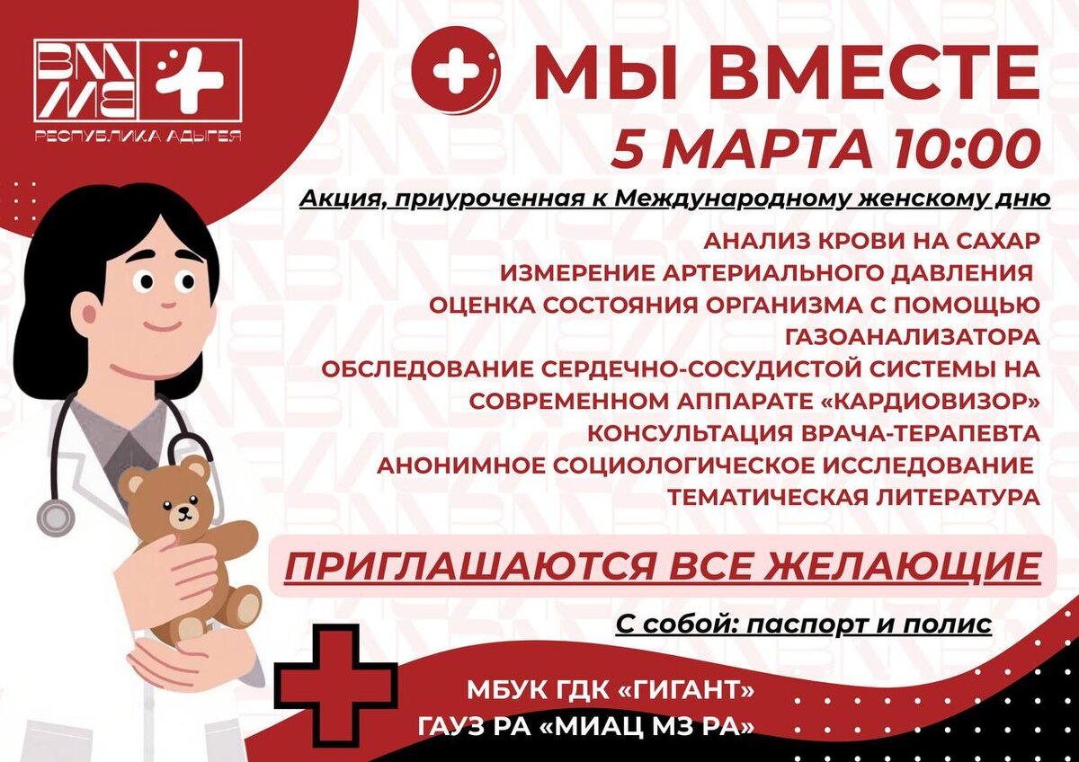 ❤️ Весна — время цветов, улыбок и… заботы о себе! В преддверии международного женского дня мы приглашаем всех желающих на День открытых дверей. 📌 5 марта | 10:00 📍 ГДК «Гигант» Проверь здоровье за 1 час: 🩸 сахар крови ❤️ давление и сердце (кардиовизор) 💊газоанализатор 🩺консультация терапевта 📋Также вас ждет анонимный опрос и полезные материалы. С собой паспорт и медицинский полис Организаторами являются: • АРО ВОД «Волонтеры-медики» • МБУК ГДК «ГИГАНТ» • ГАУЗ РА «Медицинский информационно-аналитический центр Министерства здравоохранения Республики Адыгея» 🤍 Волонтеры-медики 🤩 МГТУ