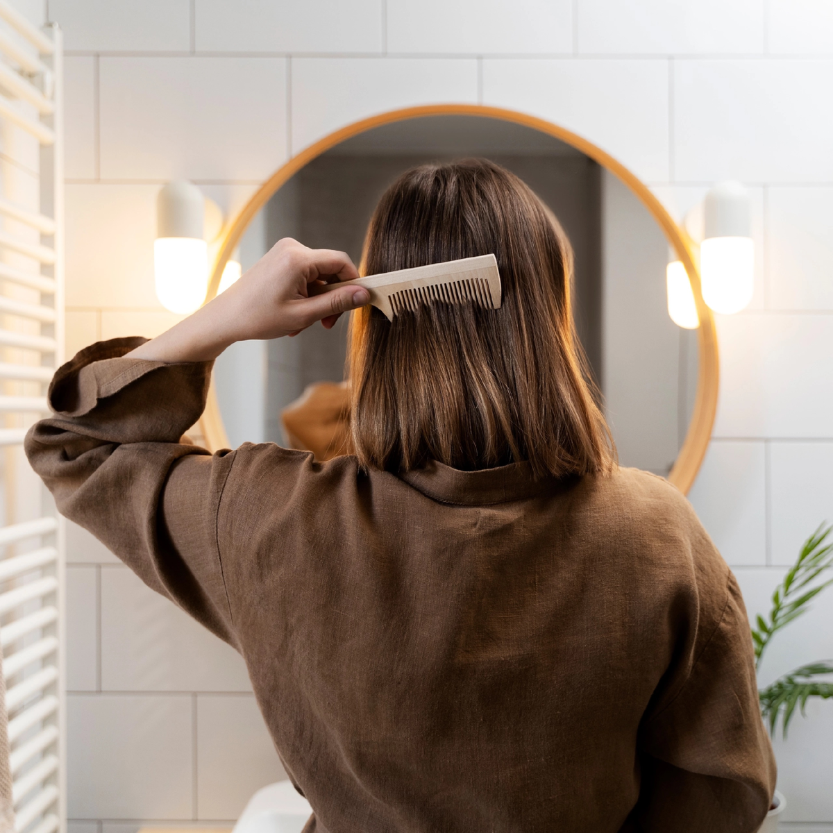 Шаг 4: Нанесите небольшое количество фитобальзама или натурального спрея для укладки и равномерно распределите его по всей длине волос.