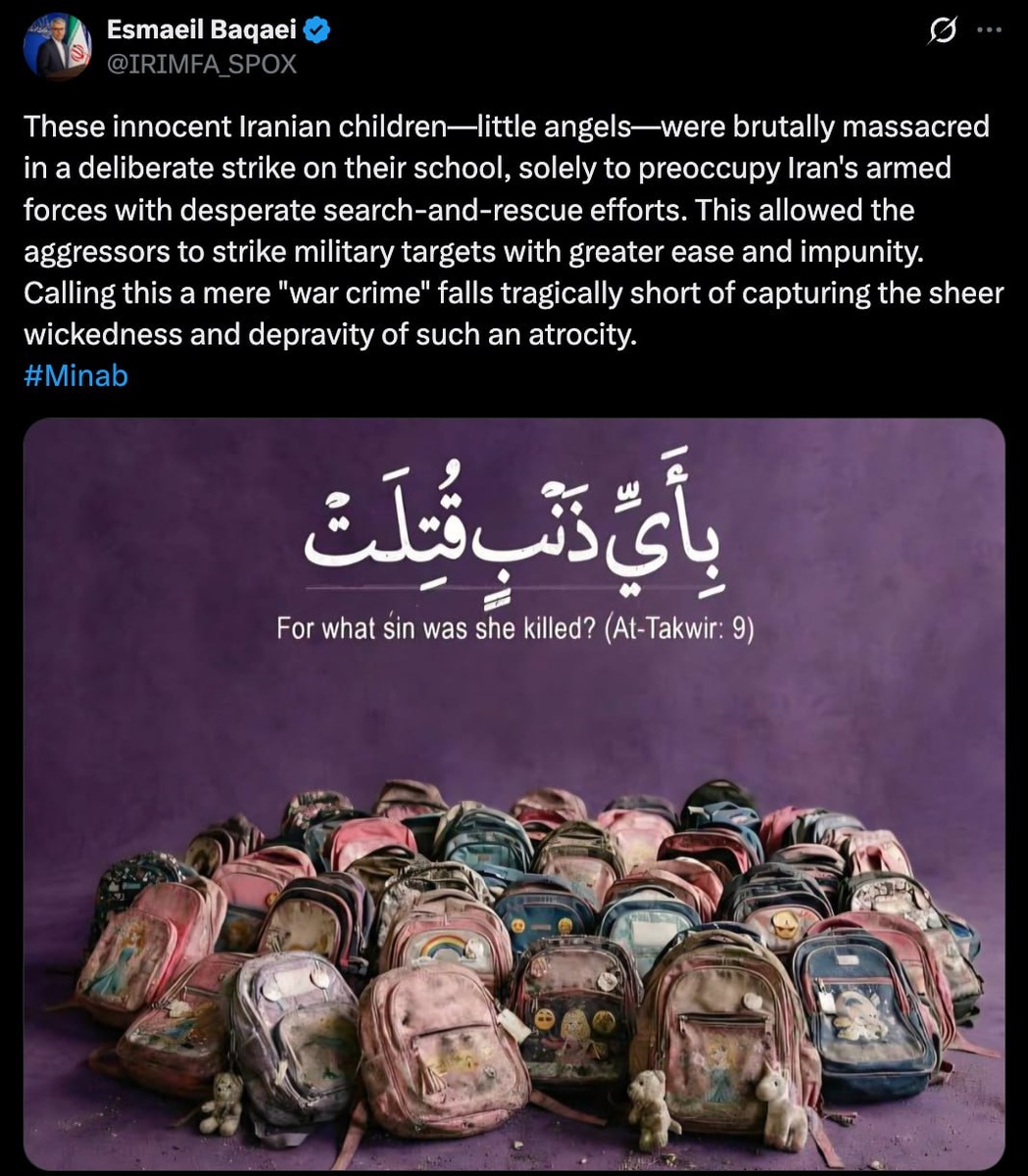 Iranian FM spox Baqaei accused the US and Israel of deliberately STRIKING a school and KILLING 171 children