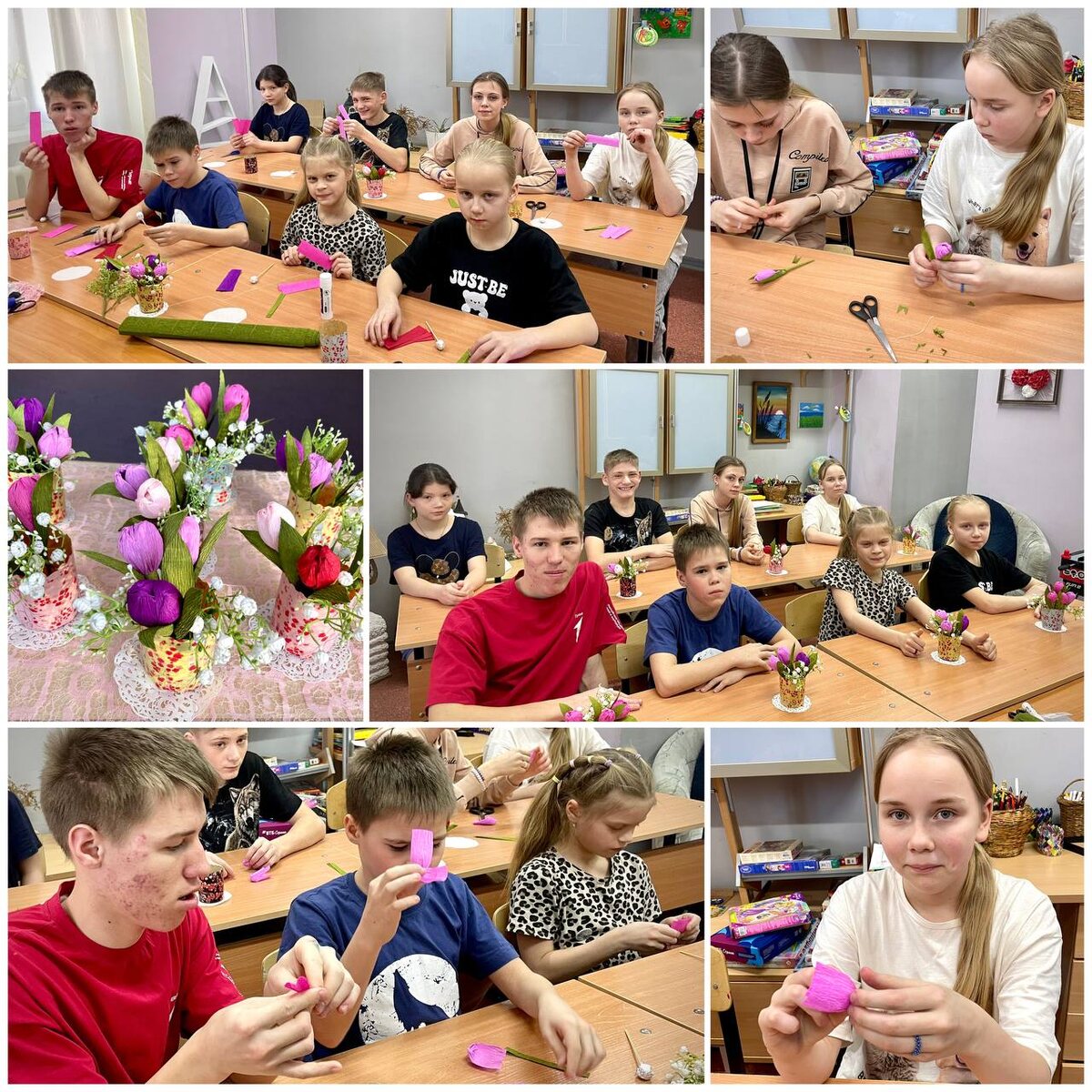 В преддверии 8 Марта в отделении социальной реабилитации прошёл мастер-класс «Весенняя сказка своими руками». Тюльпаны по праву считаются символами Международного женского дня. Они распускаются первыми, дарят ощущение весны, нежности и пробуждения. Тюльпаны символизируют счастье и радость – всё то, что хочется пожелать самым близким в этот день. На занятии ребята учились превращать гофрированную бумагу в настоящие букеты. Было особенно ценно наблюдать, как дети помогали друг другу, делились секретами, подсказывали и поддерживали тех, у кого что-то не получалось. Такие моменты учат добру и взаимовыручке ничуть не меньше, чем сам творческий процесс. В результате у каждого получилась нежная композиция. Идеальный подарок для самых родных людей. Подобные мастер-классы необходимы нашим детям: они развивают творческое мышление, усидчивость и дарят возможность почувствовать радость созидания и гордость за результат своего труда. Ребёнок вкладывает душу в поделку и учится выражать любовь через