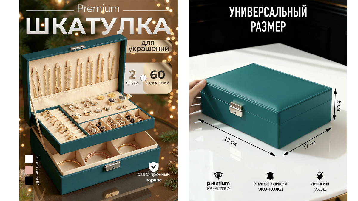 Распутывать узелки на тонких цепочках перед выходом — то еще удовольствие. Вроде бы украшений совсем немного, но на туалетном столике вечно образуется творческий беспорядок: кольца лежат в блюдечке, а серьги постоянно теряют пару. Пора наводить красоту и искать изящное спасение на Яндекс Маркете. Большая бирюзовая шкатулка привлекает внимание своим шикарным цветом. Два яруса и целых 60 отделений — сюда поместятся все ваши сокровища. Снаружи качественная эко-кожа, внутри всё мягкое и продуманное: есть валики для колец, отверстия для пусетов и даже слоты для крупных ювелирных изделий. Судя по отзывам, исполнение на высоте: все аккуратно проклеено, посторонних запахов нет, а на столике она смотрится очень компактно и стильно. Из минусов покупатели отмечают отсутствие зеркальца и немного спорное решение с крючками для подвесок — цепочки могут выпадать из кармашков при неаккуратном закрывании. Для массивных и нестандартных изделий места маловато. Зато для классических украшений это настоя