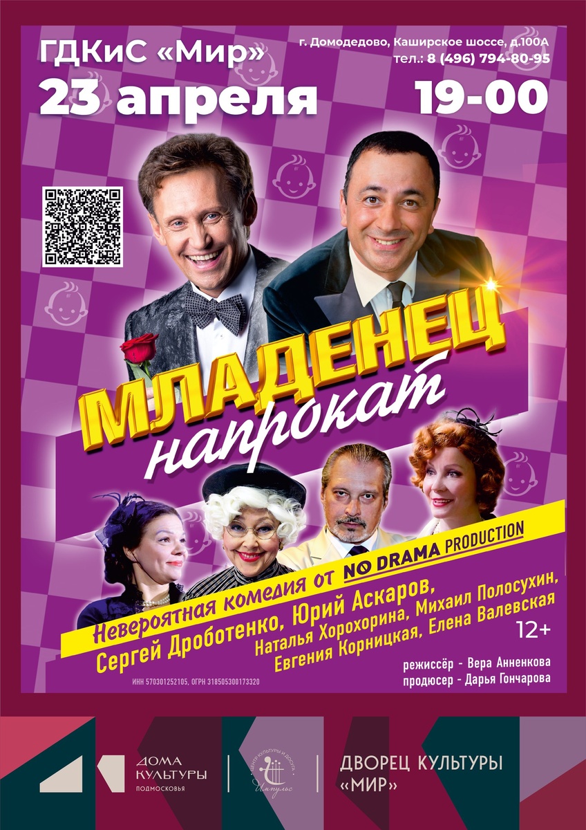 ✨ Спектакль «Младенец напрокат»🎭 ✨ Комедия по пьесе Спартака Мишулина доказывает: маленькая ложь рождает большие сложности. Чтобы вызвать ревность у мужа, главная героиня выдумывает роман, но невинный обман превращается в череду невероятных проблем. Единственный выход — срочно «родить» ребёнка к возвращению супруга… А что, если взять младенца напрокат? ✨ Эта безумно смешная эксцентрическая комедия заставит вас смеяться до слёз! 🚫 Возраст: 12+ 📆 23.04.2026🕒19:00 🏢 Дворец культуры и спорта «Мир» 📍 г. Домодедово, Каширское шоссе, д.100А 🎫 Купить билет: https://clck.ru/3RbNTV ✅ Мероприятия Домодедово https://dzen.ru/id/66f10385cc4c5a16f7b5fb02 https://vk.ru/domodedovo_events http://dzen.ru/domodedovo_events