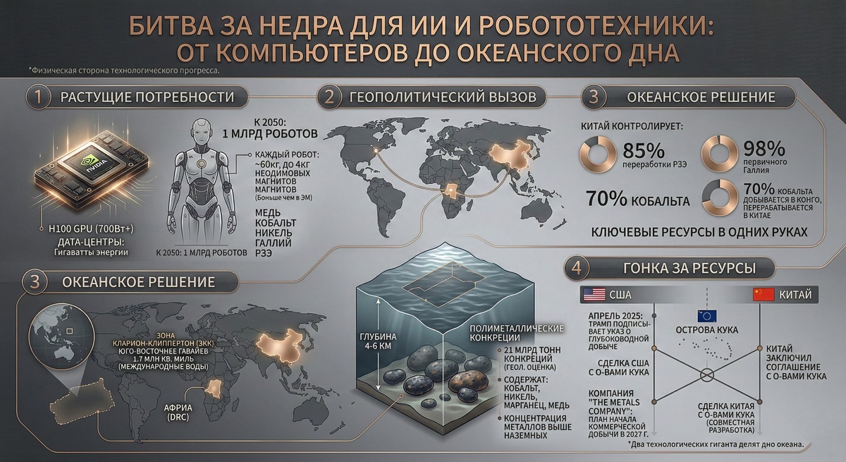 Недавно задумалась: мы все говорим про нейросети, про гуманоидных роботов, про прорывы в ИИ. Но редко спрашиваем себя: "А из чего всё это делается физически?" ✨Один GPU уровня Nvidia H100 потребляет больше 700 ватт. Дата-центр на 100 тысяч таких процессоров - это гигаватты энергии и горы металлов. Медь для проводки, кобальт и никель для аккумуляторов, галлий для полупроводников, редкоземельные элементы для магнитов. ✨А теперь добавьте сюда гуманоидных роботов. По прогнозам Morgan Stanley, к 2050 году их будет миллиард. Каждый робот весит около 60 кг и содержит до 4 кг неодимовых магнитов - иногда больше, чем в электромобиле. Илон Маск уже признал, что производство Tesla Optimus тормозится из-за китайских ограничений на экспорт редкоземельных металлов. Чем глубже погружаюсь в тему, тем все больше не по себе: ❗️Китай контролирует 85% мировой переработки редкоземельных элементов. 98% первичного галлия. 70% кобальта добывается в Конго и перерабатывается опять же в Китае. Что делать, ко