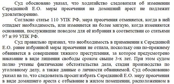 😫Адвокат, к слову, написал в жалобе: «Суд неверно изложил и исказил позицию стороны защиты. В постановлении указано, что "обвиняемая Середкина Е.О. и её защитник возражали по поводу ходатайства следователя”. Данное утверждение не соответствует действительности. Сторона защиты не возражала против удовлетворения ходатайства следователя об изменении меры пресечения, а, напротив, обращала внимание суда на наличие предусмотренных УПК РФ иных мер пресечения, не связанных с лишением свободы залога или запрета определённых действий, и просила изменить меру пресечения на более мягкую.»