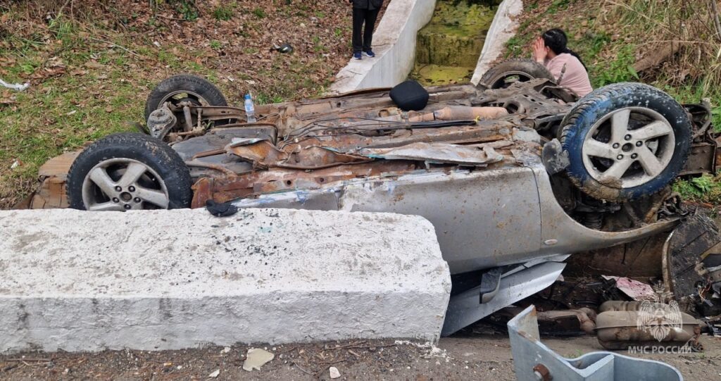 Автомобиль перевернулся в ливневку после ДТП на трассе в Сочи