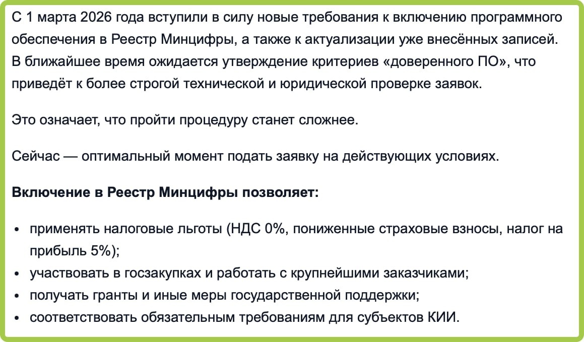 Мы проходили в реестр отечественного ПО с помощью Сколково с проектом clickfraud.ru - а вот читаю, что условия ужесточают (платили и не