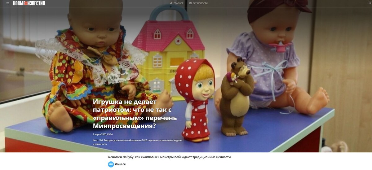 В России 2026 год назначен Годом дошкольного образования. Глава Минпросвета Сергей Кравцов объявил о создание единого перечня игрушек, соответствующих традиционным ценностям. Правда эксперты предупреждают, что «правильная» кукла — лишь малая часть сложного процесса формирования личности, - сообщает СМИ. «Игрушка сама по себе не обладает силой вкладывать ценности в сознание, это лишь инструмент для сценария. Ребенок не станет патриотом только потому, что у него есть патриотические игрушки, ценности формируются через контекст [очевидно, имеется в виду действительность], который создают взрослые», — утверждает психолог Ника Болзан. По её мнению, эффективность игры на 90% зависит от фантазии ребенка и только на 10% — от самого предмета. Ключевым фактором становится не наличие игрушки в «перечне», а то, позволяет ли она ребенку созидать. Болзан права, - тому подтверждение опыт многих поколений человечества, да и каждого из нас с вами, если вспомним себя… Игра ребёнка – это фантазия, сценар