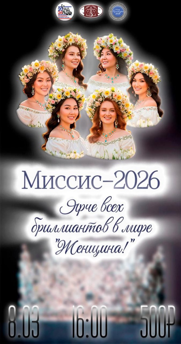 !📣 🔥Приглашаем вас стать свидетелями грандиозного праздника женской красоты, мудрости и таланта — конкурса «Миссис 2026»! В этот вечер вы увидите, как раскрываются грани женской натуры: от деловой хватки до творческой одарённости, от грации до умения импровизировать. 🔥Дата: 8 марта 2026 года 🔥Время: 16:00 🔥Место: МБУ ЭКЦ «Айхал» 📌Программа вечера: 1. «Под ваши аплодисменты» — визитная карточка участниц. 2. «Миссис офис» — деловой выход. 3. «Ритмы народов» — импровизационное состязание. 4. «Традиции в творчестве» — творческий конкурс. 5. «Грация, нежность, красота» — выход в вечерних платьях. 📌Что вас ждёт: * атмосфера праздника и восхищения; * яркие выступления и неожиданные сюрпризы; * возможность поддержать любимых участниц; * награждение победительниц и вручениеспециальных призов; 🔥Приходите и подарите себе вечер, полный вдохновения, красоты и положительных эмоций.