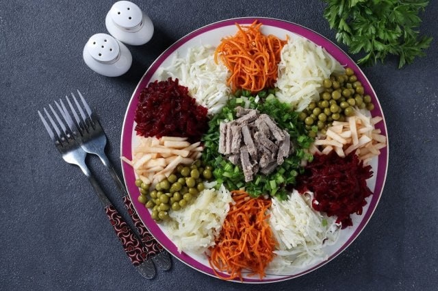 " Ингредиенты: 500 г отварного говяжьего языка, 400 г отварного картофеля, 400 г отварной свеклы, 400 г моркови по-корейски, 300 г сырой белокочанной капусты, 300 г очищенных яблок, 200 г консервированного зеленого горошка, 100 г зеленого лука, 100 г петрушки, соль, специи, соевый соус и растительное масло по вкусу. Приготовление. Говяжий язык и мякоть яблок нарежьте соломкой. Лук и петрушку промойте и мелко нарежьте, перемешайте. Капусту нашинкуйте. Остальные овощи натрите на крупной терке. В центр плоского блюда горкой выложите зелень, а на нее – мясную соломку. Морковь по-корейски разделите пополам и положите обе порции напротив друг друга. То же самое проделайте с остальными компонентами, разложив их вокруг мяса с зеленью. Для соуса перемешайте растительное масло с соевым соусом и подавайте отдельно от салата. Так же отдельно подайте соль и специи.