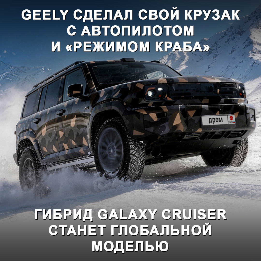 Концепт Geely Galaxy Cruiser был представлен в прошлом году в Шанхае. Теперь предсерийный автомобиль уже испытывают в суровых северных условиях. В продажу он поступит в конце года. В Сети появились фото новинки в маскировочной плёнке. Под ней видно, что по дизайну Galaxy Cruiser отсылает к Land Rover Defender. А вот салон пока не раскрыт, как и техническая часть, но журналистам удалось раскопать кое-что. По данным СМИ, Galaxy Cruiser — это гибрид с турбомотором 2,0 л или 1,5 л и тремя электромоторами. У него полный привод под управлением ИИ, автопилот и «режим краба». Запас хода на чистом электричестве составит около 350 км. Говорят, имя Galaxy Cruiser пока неокончательное. Как думаете, пусть оставят или сравнение с Крузаком не пойдёт на пользу «китайцу»? 🤔 #дромновость #китай #geely #galaxy #cruiser