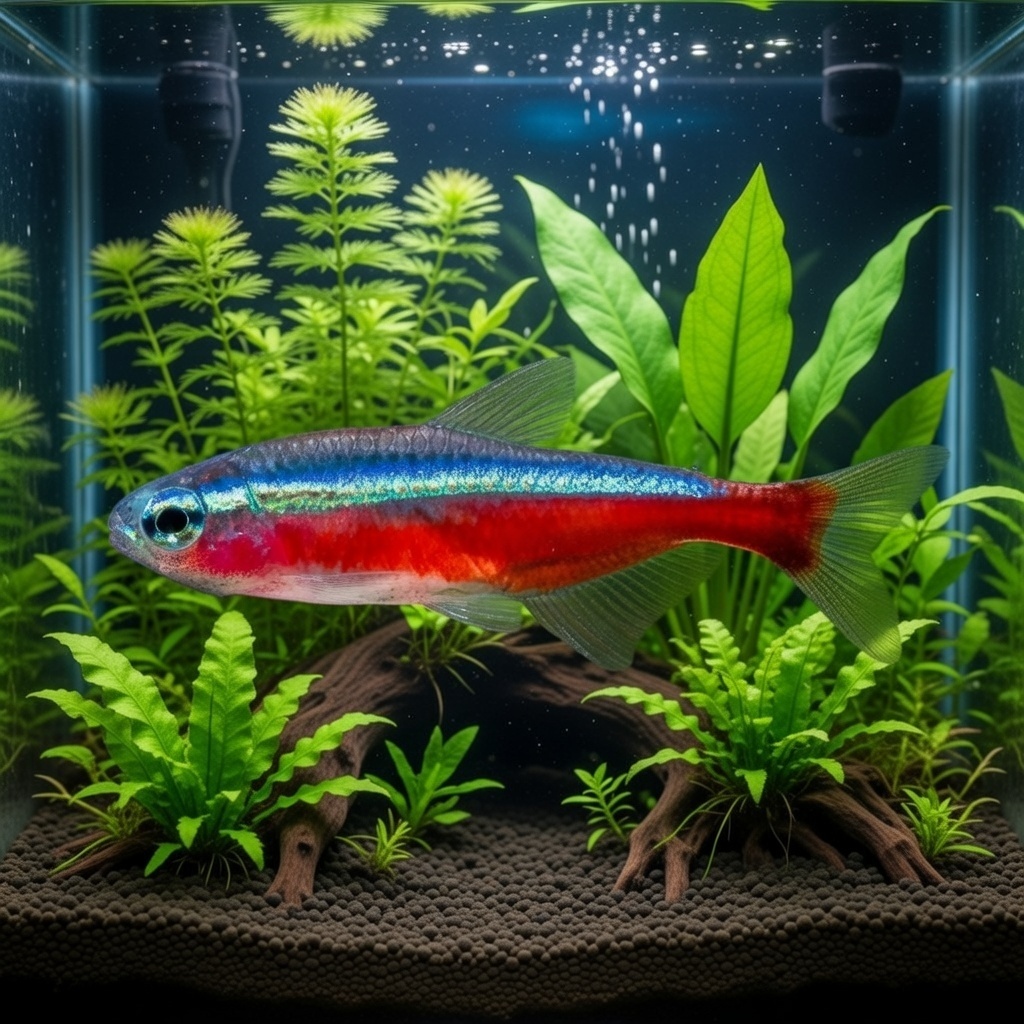 Оптимально — 60–100 литров. Чем больше стайка, тем красивее смотрится «неоновая волна». Обязательное оборудование: Неоны не любят яркий свет — лучше создать затенённые зоны с помощью растений или плавающих видов (пистия, ряска, риччия). Неоны происходят из мягких, слегка кислых «чёрных вод» Амазонии. Резкие скачки параметров приводят к