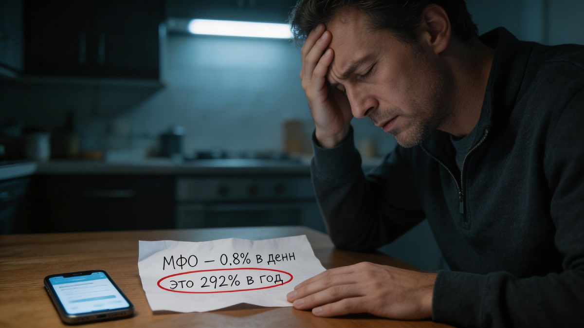 Пересчитаем в годовые. 0,8% в день — это 292% годовых. 1% в день — это 365% годовых. Для сравнения: самый дорогой банковский потребительский кредит в 2026 году обходится в 35–40% годовых. Микрозайм дороже него в 7–10 раз.