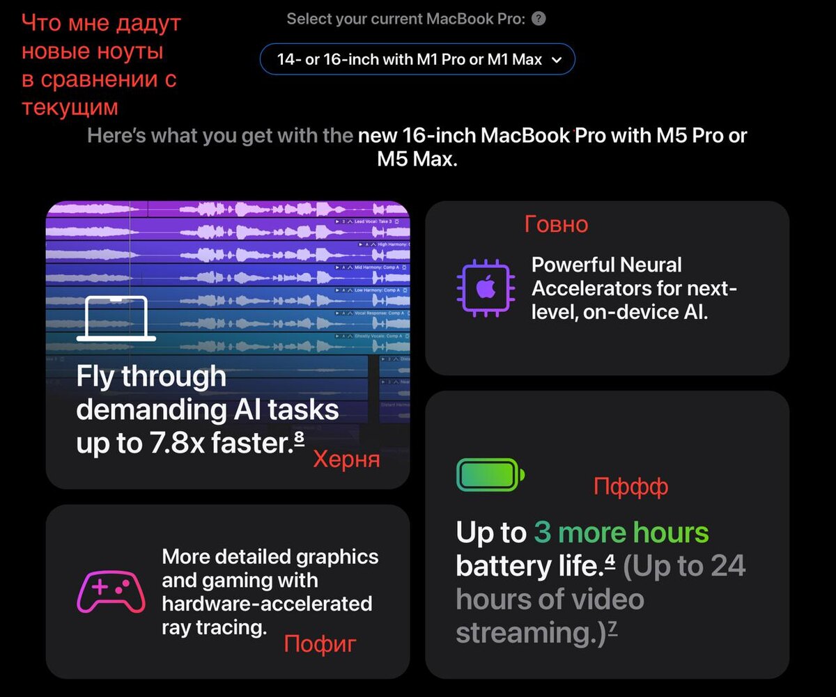 ! где новые дисплеи? где избавление от брови? где новый дизайн? где ненужный тачскрин? где размер 17 дюймов? где новая селфи камера как на айфоне? почему не убрали ненужный магсейф и не дали еще один юсб-ц? где фейс айди, раз оставили эту дурацкую дырку для камеры?