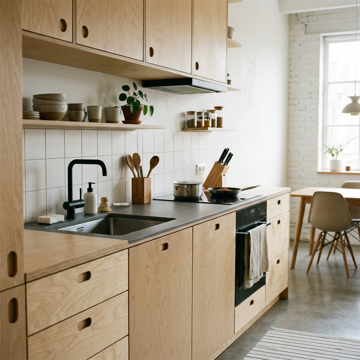 Когда человек впервые слышит про кухню из фанеры, почти всегда возникает один и тот же вопрос: «А что будет, если на неё попадёт вода?» Кухня — самое влажное место в квартире. Здесь пар, брызги, протечки под раковиной и иногда настоящие мини-потопы. Поэтому страх вполне логичный. За 15 лет работы с мебелью я видел кухни после самых разных ситуаций — от небольших протечек до серьёзных аварий с водой. Поэтому давайте честно разберёмся, как фанера ведёт себя в реальной жизни. Большинство людей знакомы только с двумя материалами: ЛДСП и МДФ. И у них действительно есть проблема с влагой. Если вода попадает в ЛДСП, происходит простая вещь: стружка начинает впитывать влагу и разбухает. После этого деталь уже невозможно восстановить. Именно поэтому чаще всего страдает шкаф под мойкой — место, где регулярно появляется вода. Этот опыт переносится и на другие материалы, хотя они устроены совсем иначе. Фанера — это не прессованные опилки. Она состоит из тонких слоев натурального берёзового шпона,