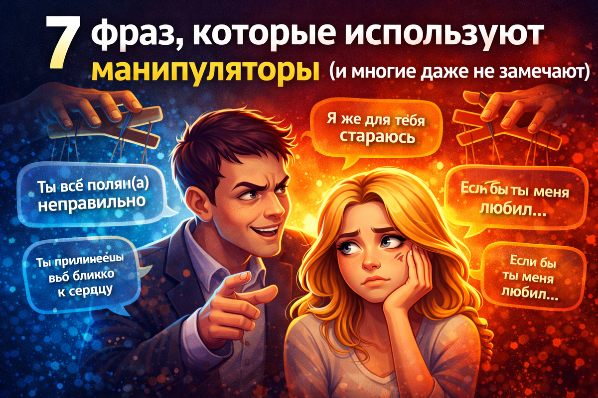 Чаще это обычные фразы, которые звучат спокойно и даже заботливо. Но их цель — заставить вас чувствовать вину, сомневаться в себе или делать то, что нужно другому человеку. Вот несколько фраз, которые часто используют манипуляторы. Эта фраза заставляет вас сомневаться в своей реакции. На самом деле человек просто пытается показать, что проблема не в его словах, а в вашей чувствительности. После этой фразы человеку становится сложно отказаться. Она создаёт ощущение, что вы обязаны согласиться, иначе будете выглядеть неблагодарно. Манипулятор пытается показать, что вы ведёте себя неправильно. Это способ заставить вас подстроиться под его ожидания. Очень распространённая фраза в отношениях. Человек связывает ваши чувства с определённым действием, чтобы получить желаемое. Когда человек говорит это, он создаёт ощущение, что все вокруг против вас. Хотя чаще всего никаких «всех» не существует. Это один из самых распространённых способов уйти от ответ