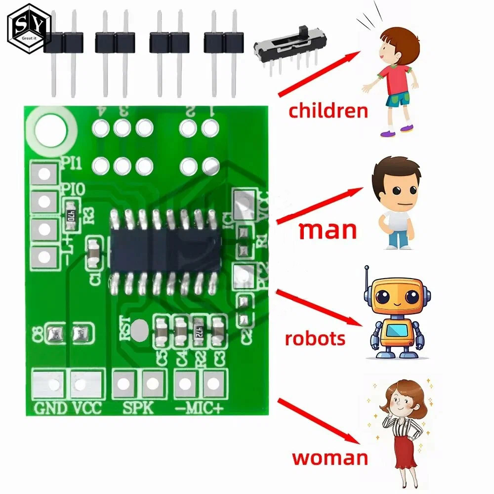 Модуль изменения голоса — это компактное электронная плата (DIY-компонент) для записи и преобразования звука. Его часто используют в игрушках, подарках или самодельных масках для создания аудио эффектов Купить можно здесь Основные характеристики: На обратную сторону платы припаиваем переключатель голосов и клеммы для микрофона, колонки и питания Припаял еще зеленый светодиод для индикации работы модуля на место -L+. Он загорается, когда происходит изменения голоса Дальше подключается динамик, микрофон и питание Запитал от литии-ионной батареи 3.7В На первом режиме что-то было слышно. Говоришь в микрофон из динамика идет детский голос. Переключаешь на другой режим лампочка загорается, потом тухнет и ничего не работает. Начал менять полярность. Использовать другие микрофоны. Ничего не помогло. Решил нужно заказать игрушку с таким модулем и посмотреть как всё устроено Разбираем Микросхема Микросхема очень похожа, другая модификация. Компоненты такие же как у меня и всё работает. Значит со