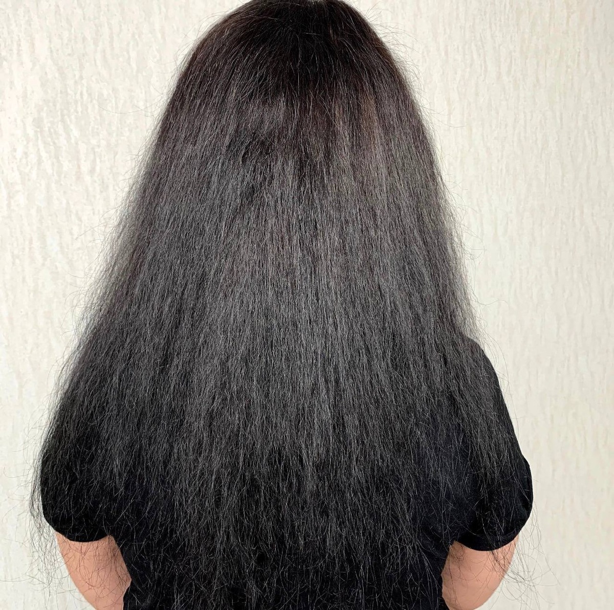 Волосы пористые и кудрявые, с сильной ломкостью после регулярного использования утюжка. Сейчас уже возвращается густота по всей длине. К сожалению, за 1–2 года нереально срастить 40 см волос. Встречаемся регулярно раз в 6–7 месяцев. Сравните волосы при первой встрече и спустя 7 месяцев после регулярного ухода! Ни одного пористого завитка.