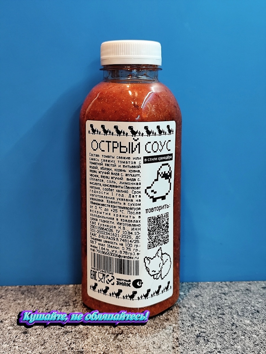Сегодня будем пробовать очередной острый соус от "КФХ Кузнецов Н.В.". На сей раз это будет хренодёр, сделанный с использованием перцев рода Capsicum chinense (к нему относится Хабанеро, Тринидадский скорпион, Каролинский жнец и прочие экстремально острые перцы). Описание стандартное для всех соусов этого производителя: Товар напрямую от производителя. 🔥 Огненно острые перцы выращиваю сам на Юге России. 🔥 Тепло перцев вида capsicum chinense отличается от привычных нам сортов типа «огонёк». Оно греет медленно, наполняя теплом юга России, где выращены эти ароматные и вкусные плоды. Наслаждайтесь этой болью с нами ;) Состав, в общем-то, видно на этикетке, но на всякий случай продублирую в текстовом виде: томаты свежие, яблоки, корень хрена, перец жгучий вида c. annuum, чеснок, жареный лук, перец жгучий вида c. chinense, соль, лимонная кислота, консерванты (бензоат натрия, сорбат калия). Яблоки-то на кой в хренодёре? Ладно, будем пробовать. Горлышко у бутылки широкое и без дозатора. Одн