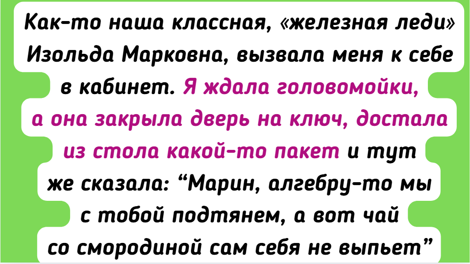 - В 9-м классе была у меня первая любовь, как водится, несчастная. Алгебру забросила, начала прогуливать уроки. Как-то наша классная, «железная леди» Изольда Марковна, вызвала меня к себе в кабинет. Я ждала головомойки, а она закрыла дверь на ключ, достала из стола какой-то пакет и тут же сказала: «Марин, алгебру-то мы с тобой подтянем, а вот чай со смородиной сам себя не выпьет. Рассказывай, кто этот дурак». И достала из пакета вкуснейшее печенье с миндалем. Оказалось, сама его пекла. Изольда Марковна тогда меня здорово подбодрила и помогла быстрее справиться с чувствами. А алгебру я в итоге сдала на 4.