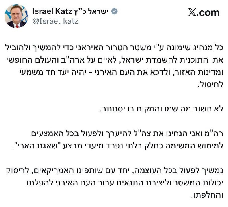 Министр обороны Израиля Кац заявил, что любой новый лидер Ирана будет ликвидирован