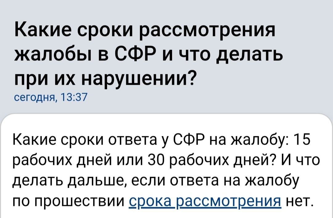 отказе в приеме документов или ошибках — 5 рабочих дней. Общие письменные обращения рассматриваются в течение 30 календарных дней. При нарушении сроков следует жаловаться в прокуратуру или суд. #СФР #жалобаСФР #срокирассмотрения #социальныйфонд #обжалование #социальныевыплаты #нарушениесроков #прокуратура