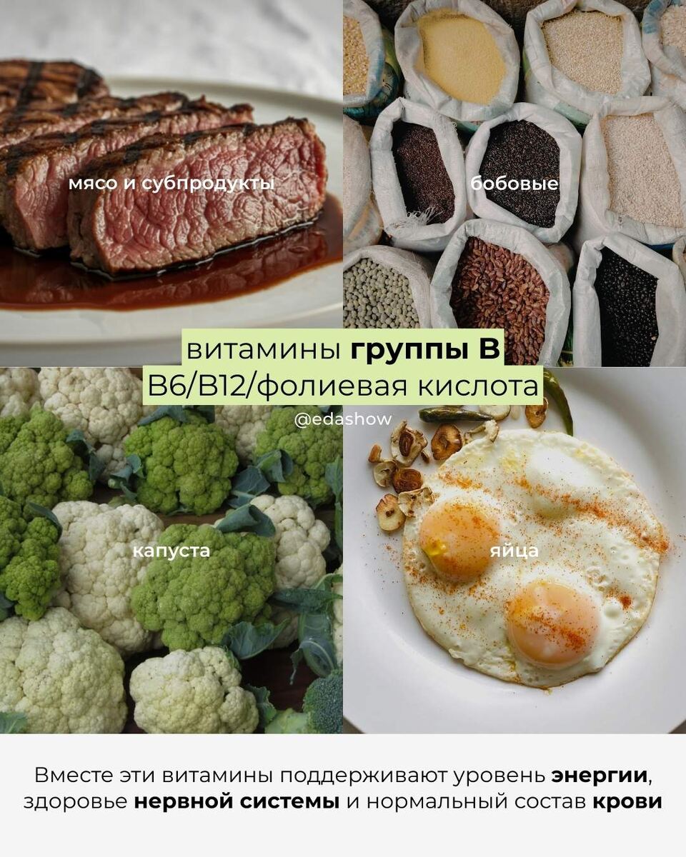 Витамины группы B — основа энергии, крепкой нервной системы и здоровой крови ⚡ B6, B12 и фолиевая кислота (B9) — это витамины, которые ежедневно участвуют в сотнях процессов в организме. Они помогают превращать пищу в энергию, поддерживают работу мозга, влияют на концентрацию и настроение, а также необходимы для образования эритроцитов. 🔹 B6 (пиридоксин) — участвует в белковом обмене, помогает нервной системе справляться со стрессом и поддерживает гормональный баланс.