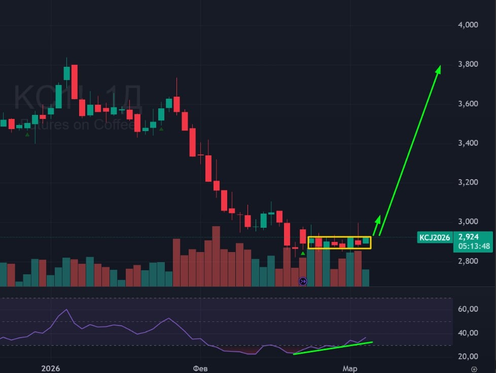 ☕️ Кофе! 🟢 Обновляю график. Ожидания без изменений. До сих пор копимся в накоплении. Динамика лучше чем у какао в плане безудержное падение тут остановилось 3 недели назад. Если на этой неделе сможем вырасти, то на недельках появится бычье поглощение с сигналом на покупку! На дневках пока все еще стоим в боковике. 🚗 Жду рост кофе в ближайшее время. #кофе #kc1 #coffee #bogdanoffinvest $KCJ6 $KCM6