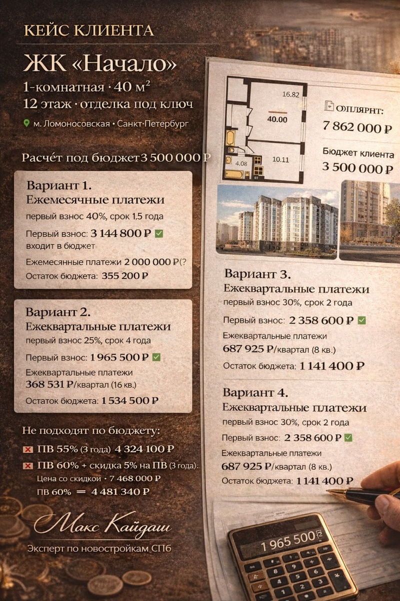 » 📍 метро Ломоносовская Цена квартиры: 7 862 000 ₽ Бюджет клиента: 3 500 000 ₽ Разобрали несколько вариантов рассрочки от застройщика. --- ## Вариант 1 Первый взнос 40% Первый взнос: 3 144 800 ₽ Остаток бюджета после взноса: 355 200 ₽ Остаток по квартире: 4 717 200 ₽ ⚠️ По таблице указаны ежемесячные платежи, но цифры требуют уточнения у застройщика. --- ## Вариант 2 Рассрочка на 4 года Первый взнос 25% 1 965 500 ₽ Остаток по квартире 5 896 500 ₽ Платежи: 368 531 ₽ раз в квартал Остаток бюджета после взноса: 1 534 500 ₽ Это самый мягкий вариант по нагрузке. --- ## Вариант 3 Рассрочка на 2 года Первый взнос 30% 2 358 600 ₽ Остаток по квартире 5 503 400 ₽ Платежи: 687 925 ₽ раз в квартал Остаток бюджета после взноса: 1 141 400 ₽ --- ## Не подходят по бюджету ❌ Первый взнос 55% — 4 324 100 ₽ ❌ Первый взнос 60% — 4 481 340 ₽ --- ## Вывод ✔️ Самая комфортная нагрузка — 25% на 4 года ✔️ Быстрее закрывается — 30% на 2 года ✔️ Все варианты укладываются в бюджет к