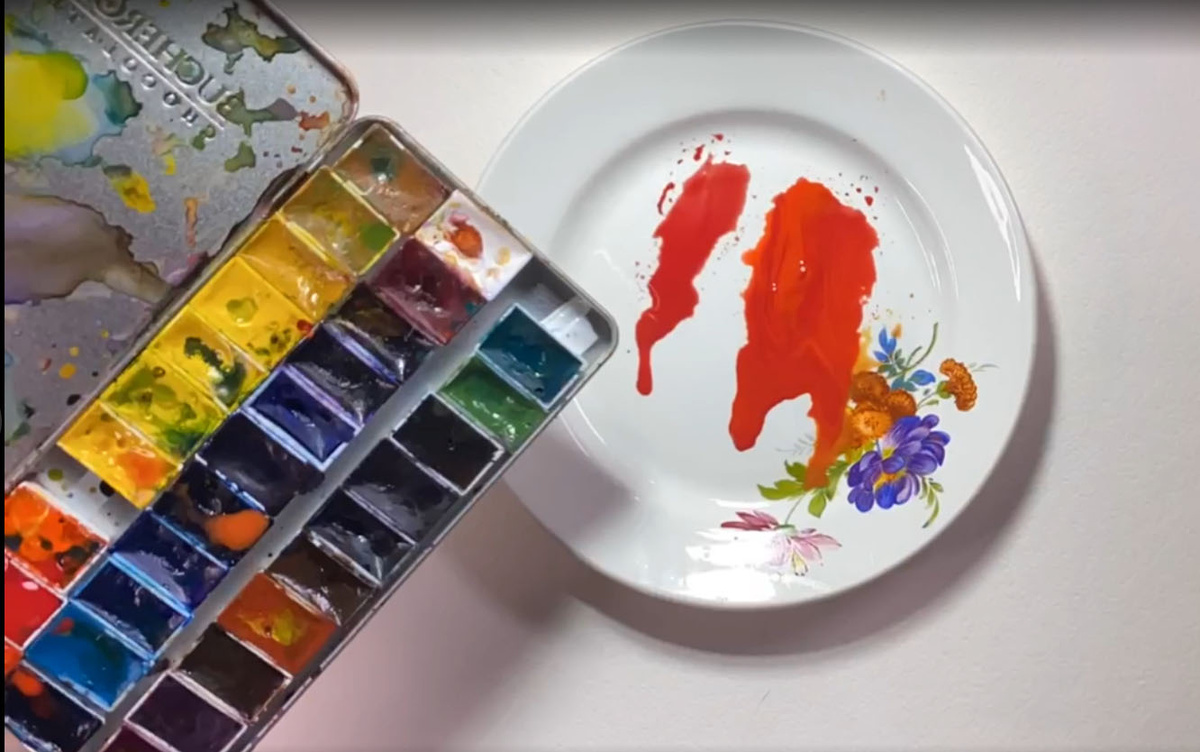 На плоской тарелке или палитре начинаем творить. Разводим разные оттенки красного: возьмите алую, кармин, можно добавить капельку розового или оранжевого. Воды не жалеем — смесь должна быть похожа на очень жидкую сметану. Цвет должен быть насыщенным и не одинаковым уже на палитре.