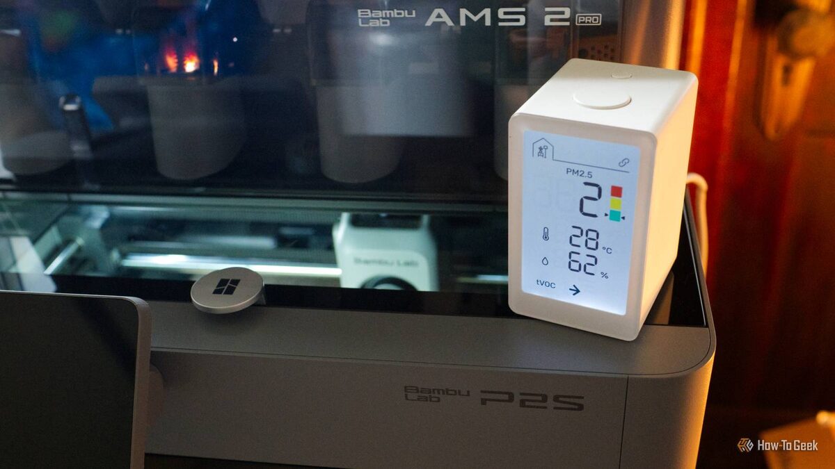 В этот раз датчик я поставил прямо у вытяжки моего 3D-принтера Bambu Lab P2S — это закрытая модель с угольным фильтром. Сам принтер стоит у нас в маленькой гостевой, где, если честно, за столом с принтером жизнь кипит куда активнее, чем на диване-кровати.