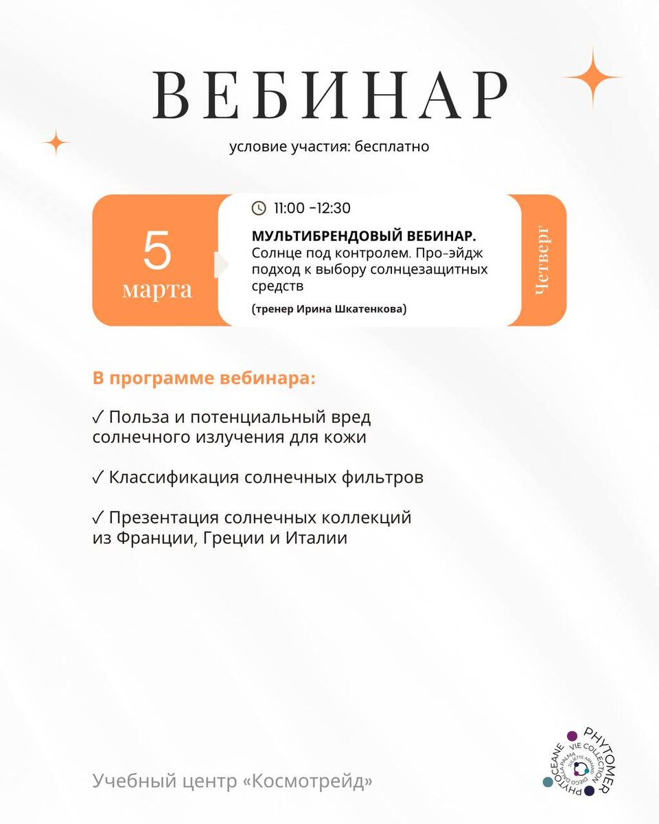 🧡 🎙️ Уже завтра, 5 марта приглашаем вас на МУЛЬТИБРЕНДОВЫЙ онлайн-вебинар Солнце под контролем. Про-эйдж подход к выбору солнцезащитных средств 5 марта 11:00 – 12:30 (МСК) 🤩 Онлайн, Zoom Вебинар проводит Ирина Шкатенкова, тренер учебного центра «Космотрейд» Ссылка для подключения ➡️ перейти в Zoom