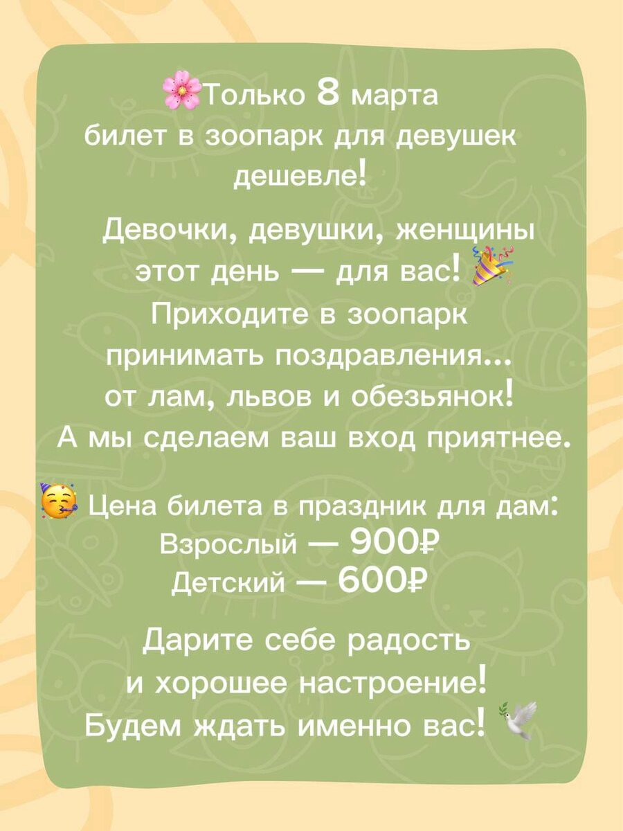 ! 💐 Совсем скоро наступит самый нежный праздник — 8 Марта. И мы хотим сделать для вас этот день по-настоящему особенным. Приглашаем всех женщин, девушек и девочек провести этот праздник в кругу самых милых животных! Для вас весь день будут работать уютные аллеи, согревать солнце и, конечно, дарить радость наши питомцы. 🦊🐒🦁 Мы работаем с 9:00 до 18:00 📍Иванчуг, Фермерская, 1 До встречи в Бабе Фросе ❤️