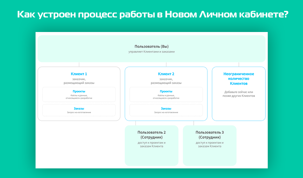 Коллеги, сегодня хотим подробнее поговорить с вами о том, каким образом работает наш Новый Личный кабинет с точки зрения пользователя — разберемся, что такое многопользовательская система и почему это упрощает работу над проектами. Новый Личный кабинет построен по принципу «один пользователь - несколько клиентов - команда». Это удобно, если вы ведете проекты разных компаний или работаете в команде. ✅ Один аккаунт — несколько клиентов Вы управляете всеми проектами и заказами разных Клиентов из одного профиля. Не нужно каждый раз входить в разные аккаунты или делиться личными логинами и паролями с коллегами. ✅ Клиент — владелец проектов и заказов Клиентом может быть как юридическое, так и физическое лицо. Именно к Клиенту привязываются проекты и заказы. Обратите внимание, что Клиента нужно добавить прежде, чем приступить к созданию проекта для заказа. ✅ Многопользовательская система Вы можете предоставить доступ вашим коллегам. Они смогут работать с проектами и заказами в рамках своего у