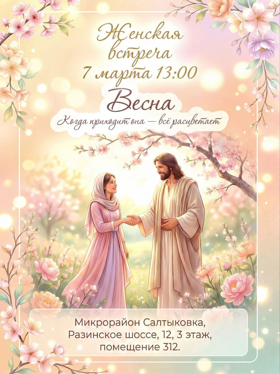 Дорогие девушки, женщины, приглашаем вас на женскую встречу, которая пройдёт 7 марта в субботу в 13:00 в нашей церкви.