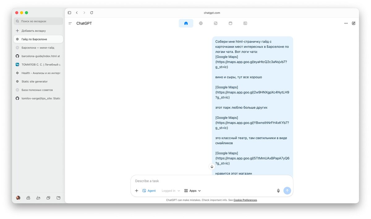 Вместе со временем на подготовку этого поста Я вчера попросил друзей об их любимых местах в Барселоне. Спасибо, друзья за рекомендации! Сегодня, я скопировал сообщения, вставил в ChatGPT и попросил собрать для меня страничку Ведь страничкой пользоваться удобнее, чем переключаться по чатам, скролить и искать И страничка готова! Были даже дизайн-правки. Я попросил добавить превью карты в карточки И вот оно живое! Живое! Барселона — гайд Что-то в голове потихоньку кристализуется. Может в гипер-персонализированных, личных "продуктах" что-то и есть. Особенно, если сократить время от идеи до продакшена с 20 минут до 2 В этом посте есть большое видео, которое не загрузилось в Дзен. Откройте оригинал поста в телеграме, чтобы его посмотреть