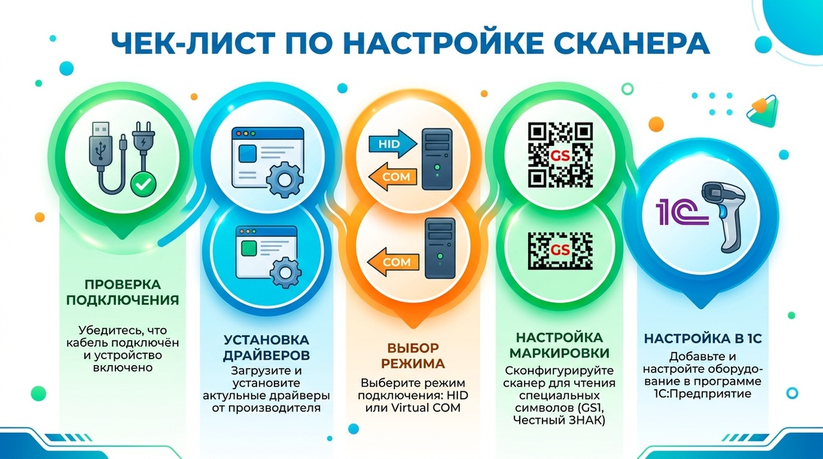 Коллеги, знакомая ситуация: касса работает, 1С запущена, а сканер — молчит. Или пищит, но данные не передаёт. Или передаёт, но с ошибками. Вместо того чтобы сразу звонить в техподдержку, пройдите по этому короткому чек-листу. В 9 случаях из 10 проблема решается за 5 минут, и сейчас вы узнаете, как именно. Настроить сканер штрихкодов Звучит банально, но именно здесь кроется львиная доля проблем. Это главный камень преткновения при работе с 1С и кассовым ПО. Если сканер работает в «Блокноте» (открыли, просканировали — цифры побежали), но не работает в 1С, проблема почти всегда в драйверах и режиме работы. Для корректной работы с 1С нужен драйвер АТОЛ ДТО. Скачайте его с официального сайта. ❗️ Важное предупреждение: Бесплатная версия драйвера имеет задержку в 10 секунд перед передачей данных. Для работы в магазине это критично. Если вам нужна мгновенная реакция, придётся приобрести платную версию. Почему сканер работает в «Блокноте», но молчит в 1С? Потому что они говорят на разных языках