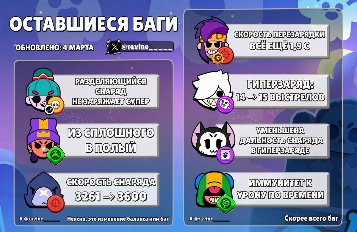 🎼 Зигги 🟠 Звёздная сила "Великий Зиггини": скорость перезарядки 1.9 сек (вместо 1.8 сек). 🙂 Джиджи 🟡 Некоторые разлетающиеся снаряды не заряжают её Супер. 🐦⬛️ Ворон 🔴 Обычная атака летит с той же скоростью, что и при использовании Гиперзаряда. 🤪Колетт ⚙️ Гиперзаряд: перезаряжается за 15 ударов (вместо 14) 🐱 Кит ⬇️ Дальность Снарядов при Гиперзаряде уменьшена ⭐️ Леон 🟢 Гаджет "Упавший Леденец": леденец не получает урон от яда 🎧 Мина 🟢 Гаджет "Мельница": из сплошного в полный не (не совсем понятно, что первоисточник имел ввиду). ✅Новости по Clash Royale - ТЫК Мир Supercell. Подписаться