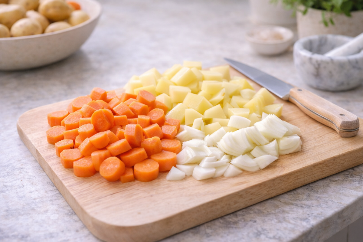 Не требует идеального рецепта. Овощи могут быть разными: морковь, картофель, тыква, брокколи, цветная капуста. Главное — дать им время свариться и превратиться в нежную текстуру. Пока овощи варятся, кухня будто замедляется. Этот ритм — один из самых простых способов переключиться после насыщенного дня. — Картофель — 2 шт.