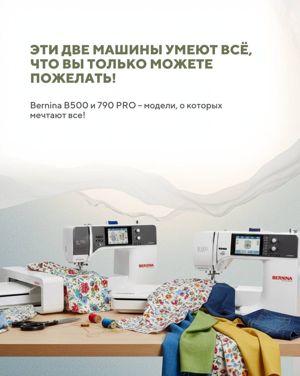! 🪡 До 31 марта в наших магазинах и на сайте вы можете приобрести модели Bernina 790 Pro и B500 со скидкой до -20% Bernina 500 – специализированная вышивальная машина с вертикальным ротационным челноком Bernina Hook, обеспечивающим идеально ровную строчку и стабильную работу. Встроенные 275 дизайнов вышивки, 8 алфавитов, увеличенная шпуля Jumbo (на 70% больше нити) и максимальная скорость 1000 стежков в минуту. Вышивание на рукавной платформе без распарывания готовых изделий. Bernina 790 PRO – флагманская швейно-вышивальная машина с усиленным мотором и вертикальным челноком Bernina Hook. Огромное рабочее пространство, десятки программ для шитья, вышивки и квилтинга, точнейшая настройка параметров и патентованная система транспортировки ткани для безупречного результата на любых материалах. Посмотреть и приобрести модели