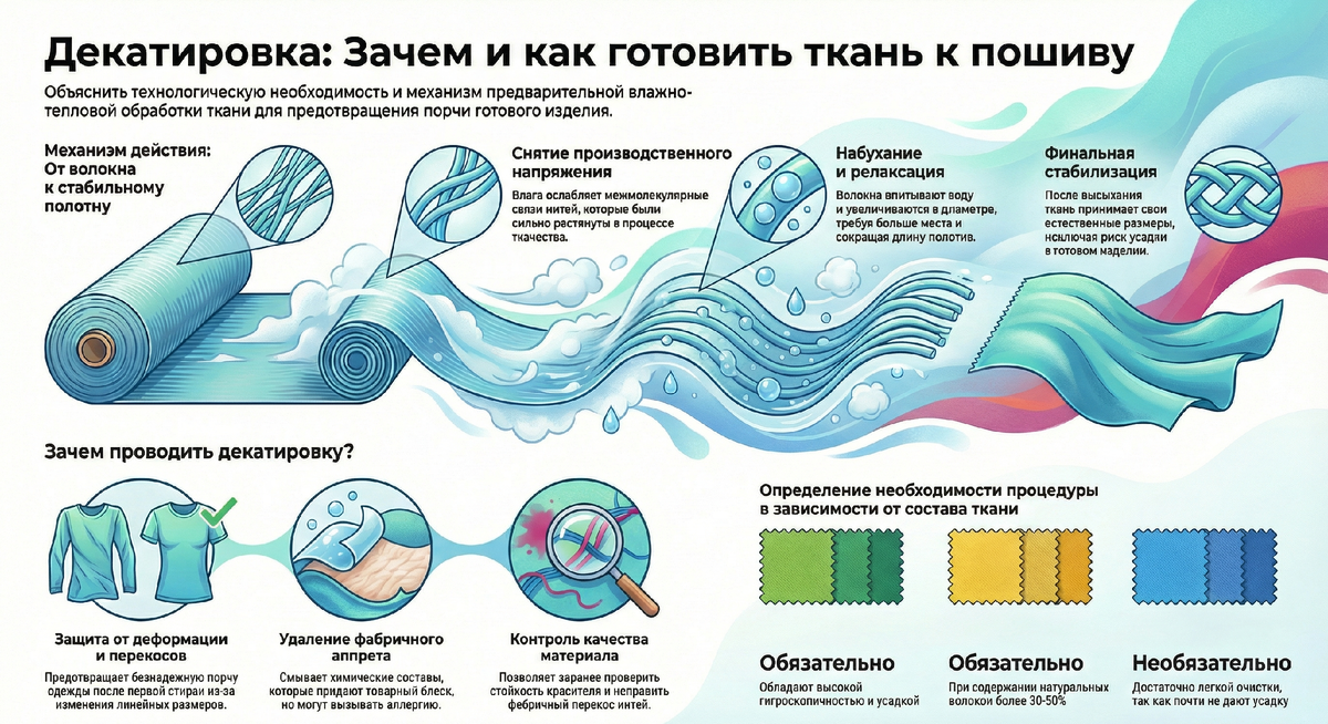 Знакомая ситуация? Вы потратили несколько дней на поиски той самой идеальной выкройки. Купили дорогую ткань. Посадка по фигуре — просто песня, все вытачки на месте, строчки ровные. Вы надеваете обновку один раз, радуетесь, а потом отправляете её в стирку... И достаете оттуда вещь, которая с треском налезает разве что на вашего кота. 🐈😅 Давайте честно: мы все иногда этим грешим. Глаза горят, руки чешутся поскорее сделать первый разрез ножницами, и скучный подготовительный этап хочется просто пропустить. Но сегодня я хочу поговорить о декатировке — той самой процедуре, которая спасет ваши нервы, сотни часов труда и десятки тысяч рублей на ткани. Если говорить простым языком, декатировка — это генеральная репетиция первой стирки или химчистки. Мы принудительно заставляем ткань «сесть» до того, как начнем кроить детали. Чтобы понять, зачем это нужно, представьте, что переживают нити на фабрике 🏭. В процессе прядения и ткачества их безжалостно тянут, крутят и обрабатывают на станках. В