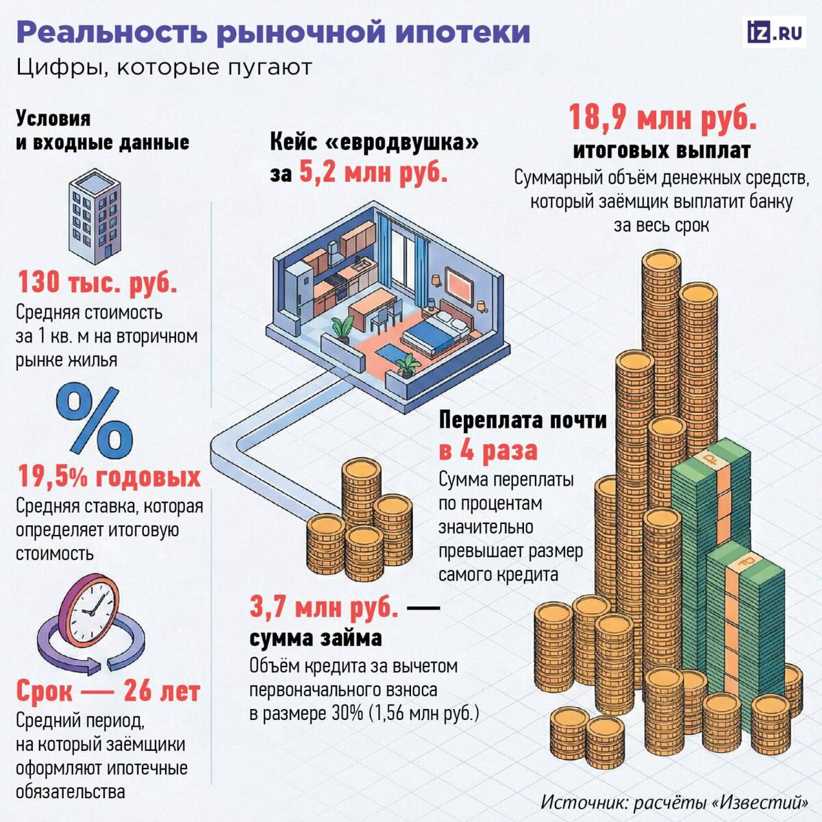 Цифры говорят сами за себя. Даже после смягчения политики регулятора переплата по ипотеке остаётся существенной. Разберём на конкретных примерах. 👨👩👦 Семейная ипотека под 6% Средняя цена новостроек - около 208 тыс. ₽ за кв. м. Типовая «евродвушка» 40 м² - примерно 8,3 млн ₽. ⏩ Первый взнос 30% ⏩ Кредит - около 5,8 млн ₽ ⏩ Срок - 27,4 года ⭕️Итоговая сумма выплат - порядка 11,8 млн ₽ ⭕️Переплата - около 6 млн ₽ Фактически половина суммы уходит на проценты. Одна квартира - почти по цене двух. 🏠 Рыночная ипотека - ещё жёстче На вторичном рынке средняя цена - 130 тыс. ₽ за кв. м. Та же «евродвушка» - около 5,2 млн ₽. ⏩ Первый взнос 30% ⏩ Кредит - 3,7 млн ₽ ⏩ Ставка - около 19,8% ⏩ Срок - 26 лет ⭕️Общая сумма выплат - примерно 19 млн ₽ ⭕️Переплата превышает сумму кредита почти в 4 раза. ✏️Прежде чем принимать решение, важно просчитать все: реальную нагрузку, альтернативные варианты и стратегию покупки. ✅ Подписаться | Недвижимость Юга⛰️
