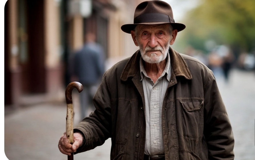 Позади стоял не высокий старичок в поношенном пальто, с тростью и аккуратной шапкой.