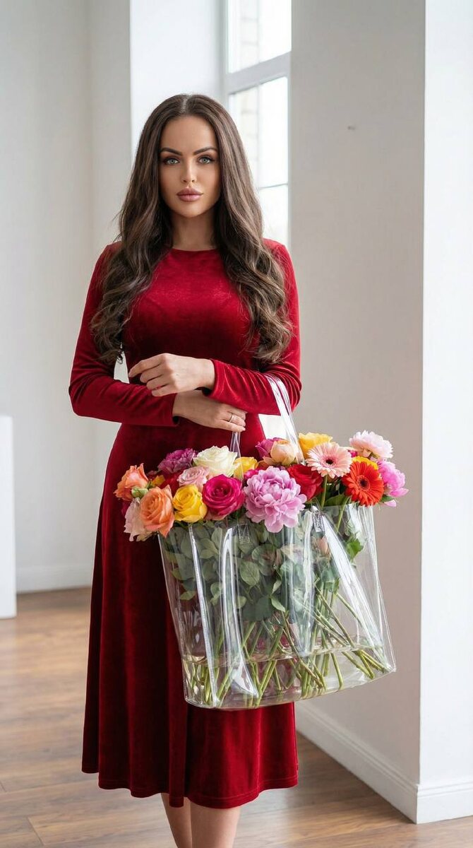 Девушка в красном бархатном платье с прозрачной сумкой цветов