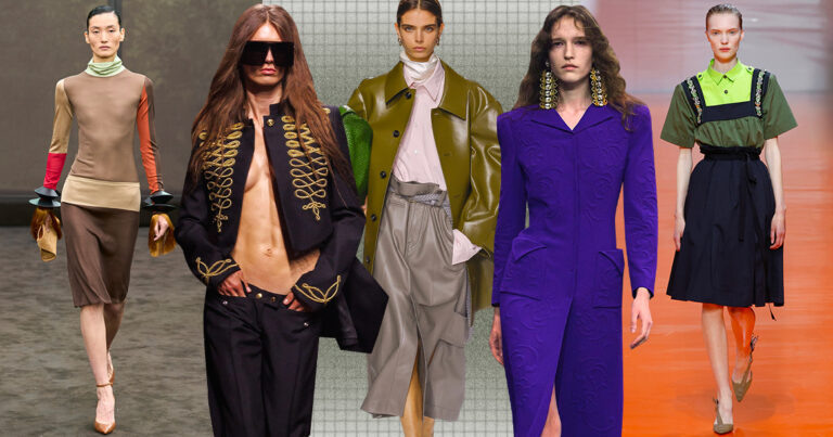 Дизайнеры предлагают на весну и лето все и сразу — колор-блок, различные текстуры (например, бахрому и перья), романтизм с одновременно строгими гусарскими жакетами, расслабленную сонливость в образах и ретроэстетику «традиционных жен». С такими контрастами в этом сезоне нам вряд ли удастся выглядеть одинаково два дня подряд. Весной дорога смелым сочетаниям оттенков — дизайнеры предлагают эффектные вариации синего, алого, солнечно-желтого и салатового, которые оживят любой самый спокойный и нейтральный комплект. В Ferragamo Максимилиан Дэвис обратился к эстетике дресс-кодов 1920-х, переосмыслив их в современном ключе, например платье с графичными шелковыми вставками, а Celine и Loewe выбрали мелкую разноцветную полоску. Прием колор-блокинга также отчетливо прослеживался в коллекциях Versace, Jil Sander и Prada. Двумя главными цветами года точно можно назвать ярко-зеленый, который с нами еще с альбома «Brat» Charlie XCX, а также оранжевый, за который стоит передать отдельное спасибо Тим