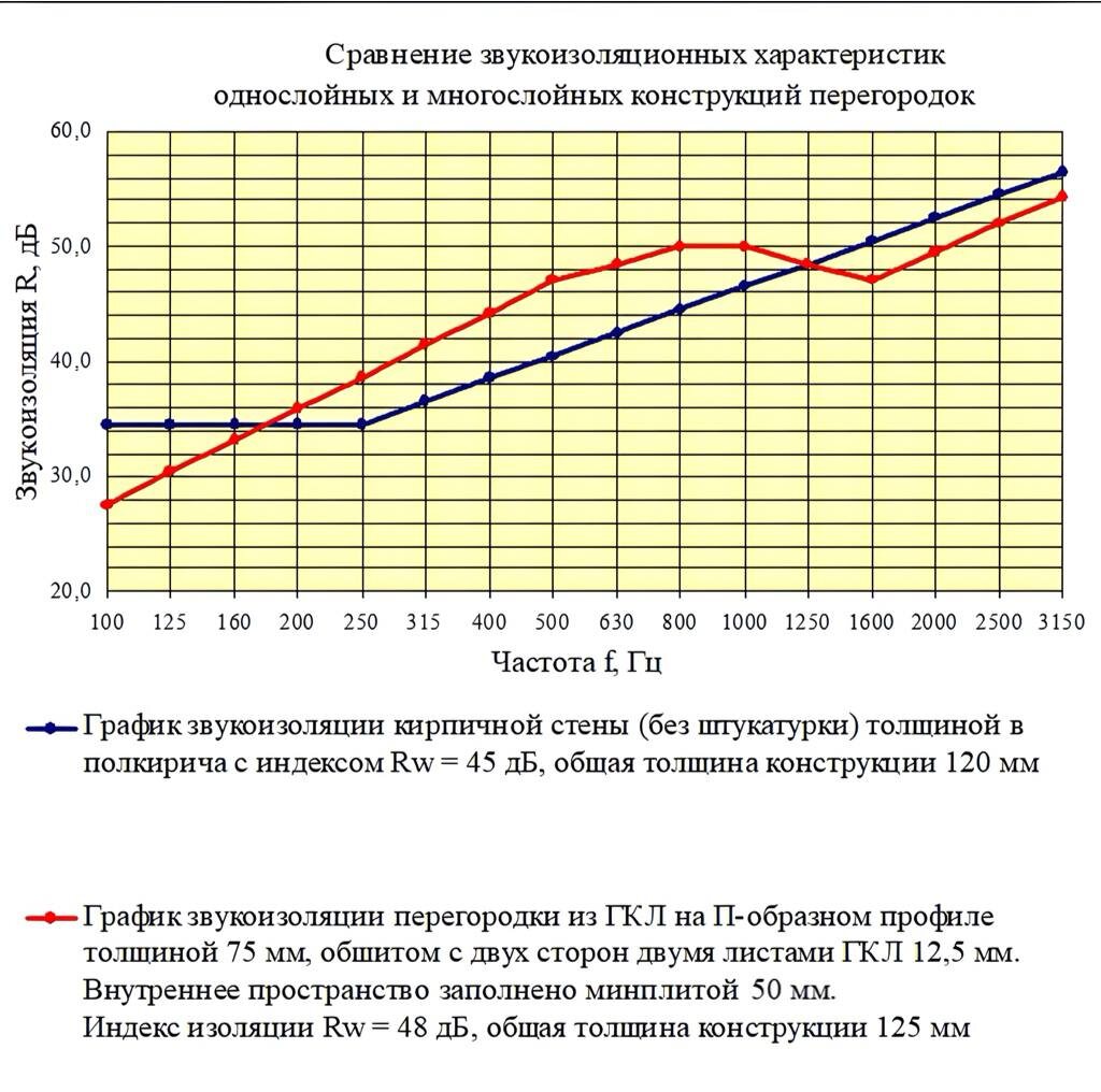 При разделении больших помещений на несколько комнат ключевым становится вопрос акустической обособленности. От того, насколько грамотно устроена перегородка, зависит комфорт и приватность в помещении. Все решения можно разделить на два типа: однослойные и многослойные. Однослойные конструкции Это перегородки из плотных материалов — кирпича, гипсолита, керамзитобетона или железобетона. Их звукоизоляционные свойства определяются, прежде всего, массой: при двукратном увеличении массы прирост изоляции составляет около 6 дБ. Пористость материала может немного повлиять на результат, но чаще снижает массу, поэтому общая эффективность остаётся средней. Такие перегородки изолируют звук лишь за счёт своей тяжести, поэтому их нельзя назвать эффективными с точки зрения звукоизоляции. Многослойные конструкции Здесь принцип иной: используется сочетание жёстких и мягких слоёв. Плотные материалы — гипсокартон, МДФ, кирпич — работают как звукоизоляторы, а лёгкие и волокнистые — как звукопоглотители,