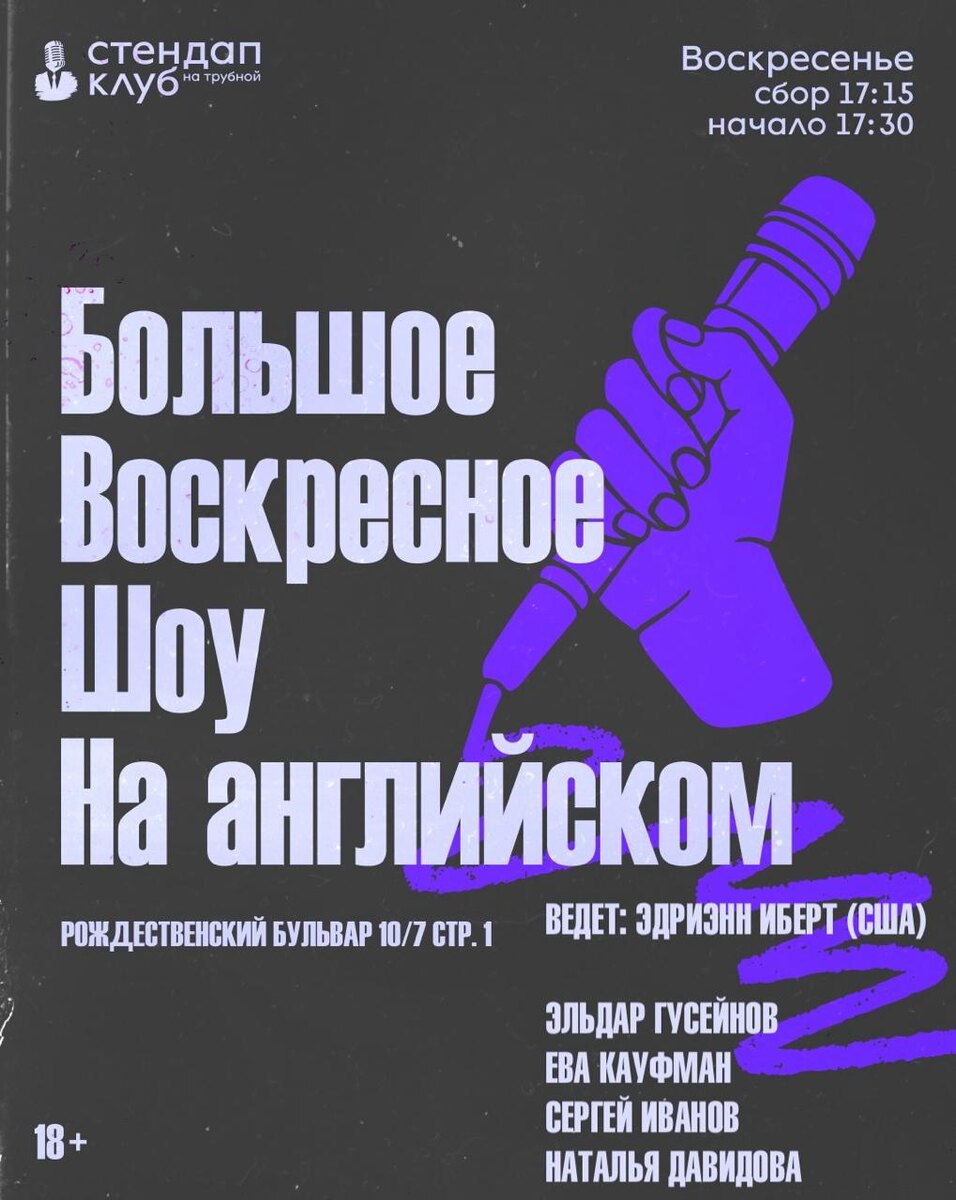 ❕ We're here under the brand new name 💖 Большое Воскресное Шоу На английском 💖 but are just as big, just as fun, and just as in English as we've always been! This week, for our inaugural show under our new name, we have: Founder of the club 🏁 Eldar Guseynov Eva Kaufman 👸🏻 who's already been opening for local superstars Organizer of foreign language comedy tours throughout Russia 🧳 Sergey Ivanov Natalie Davidova 🏔 who is Caucasian, but not like that and our host Adrienne Ebert (USA) 🥺 who is caucasian in the boring, American sense of the word Стендап Клуб на Трубной 🕢Time: 17:30-18:55 🗺️Address: Rozhdestvensky Blvd, 10/7 С1 🎟Entrance: FREE. 💸 Donations for the show are welcome, one drink minimum required 🍸 🔗Click to reserve seats here!